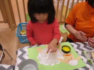 ゆびえのぐを指先につけて、トントンと、色づけもしました![]()