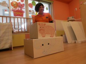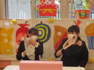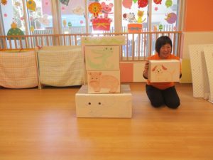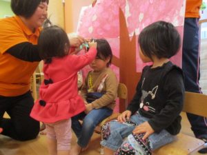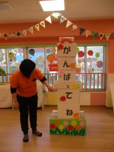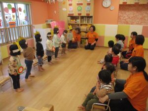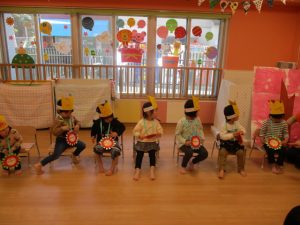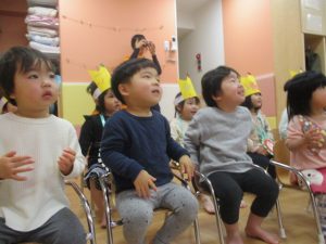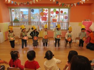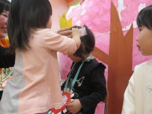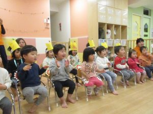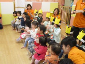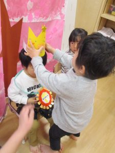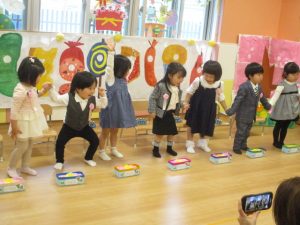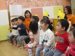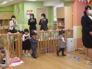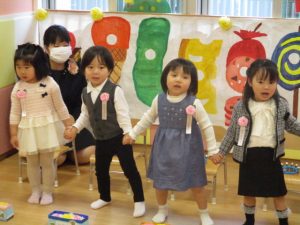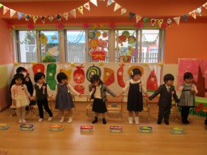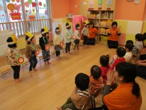 ももぐみさん?、いちごぐみさん?より、りんごぐみ?のお兄さん、お姉さんに「ありがとう」の気持ちと「新しいところで頑張ってね」という思いで、「お楽しみ会」が行なわれました