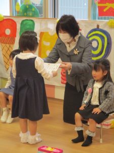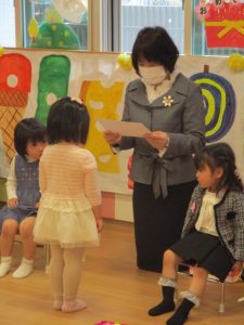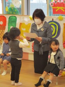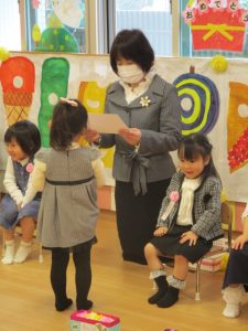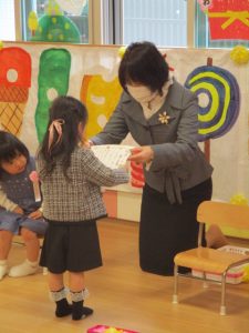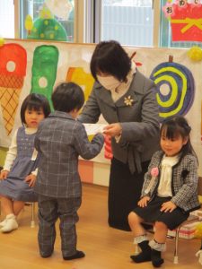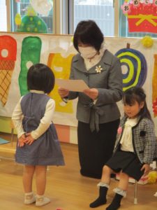 園長先生のお話の後、一人ずつ修了証書の授与がありました