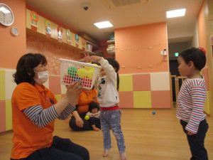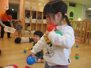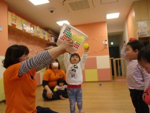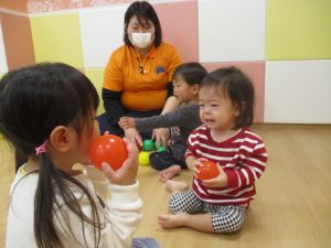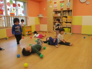 今週は、キーボードに合わせて歌を歌ったり、ボール遊びや新聞紙あそびをしたり、リトミックをしました