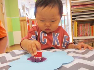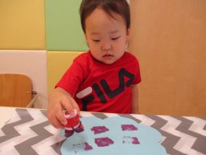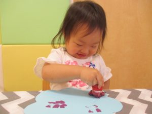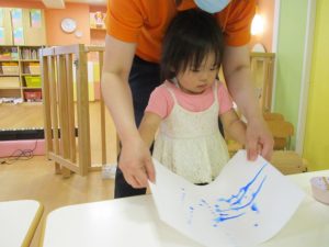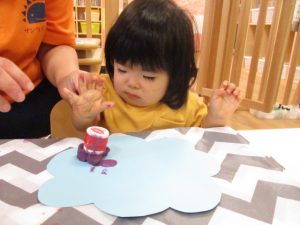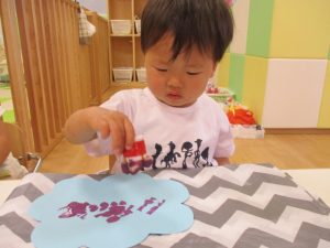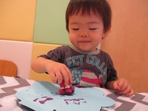 絵の具のスタンプが重ならないように押しているお子さんもいれば、重ねて同じところをペタペタしているお子さん、