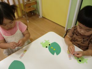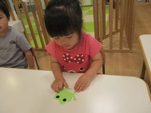 そして、かえると葉っぱにシールを貼ります
