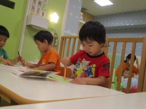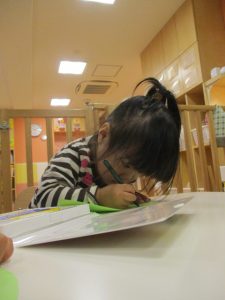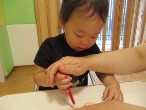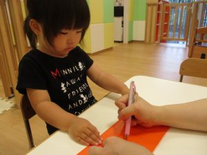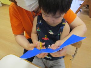 保育者と一対一で、ハサミを持って、チョキチョキと線の上を切っていきます