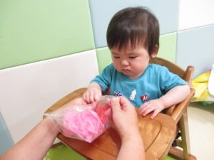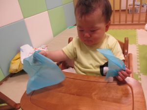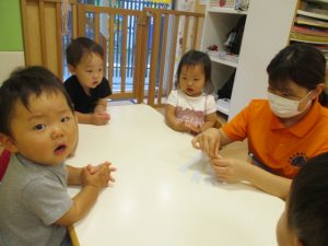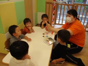 保育者の話、説明を聞いた後、配ってもらうのを待っていますよ