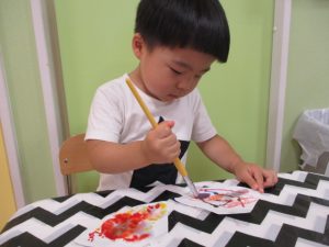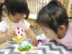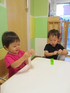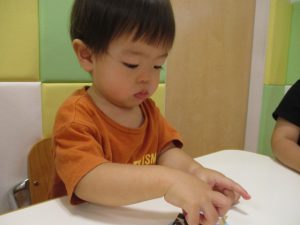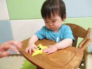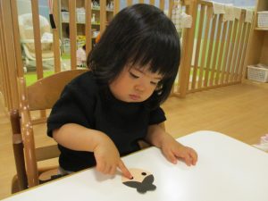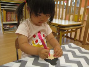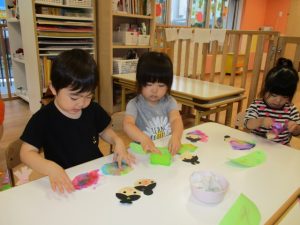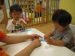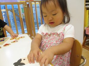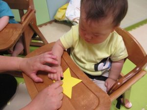 真剣な眼差しで指先を使って、保育者とペタっと上手に貼ることができました??