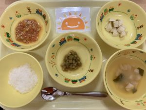 粥 鶏のトマト煮 なすのうま煮 バナナ