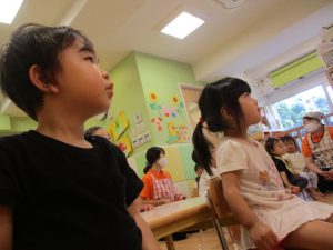 絵本の世界に入り込み、思わず立ち上がって指差しをしているお友だちもいますよ![]()
