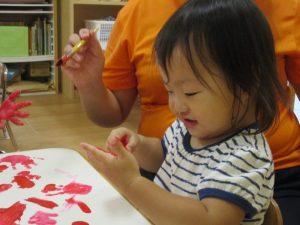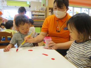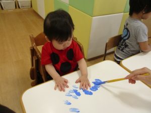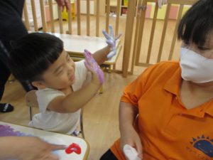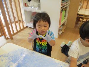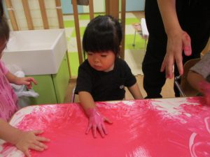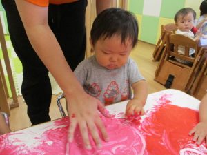手✋に絵の具をつけてもらい、楽しいフィンガーペインティングが始まりましたよ![]()
