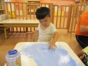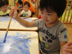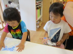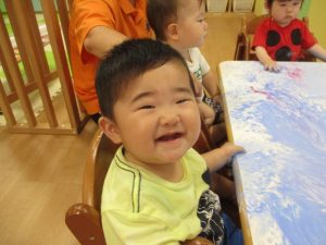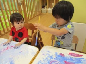 いつもとは違う絵の具の使い方に、大喜びの子どもたちでした![]()