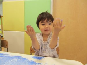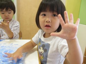 手に絵具をつけてもらったけど、いいのかなぁ…?