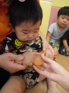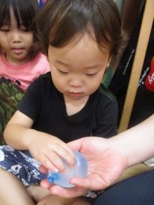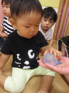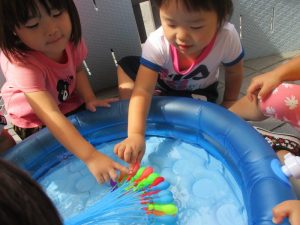 少しずつ風船の中に水がはいっていく感触を楽しんだり![]()