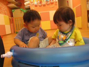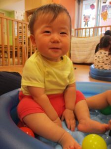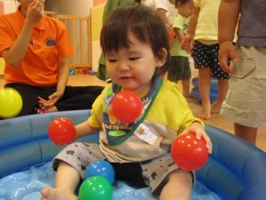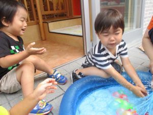 できあがった水ふうせんがプールに落ちて顔に水が飛んできたことに驚いたり…![]()