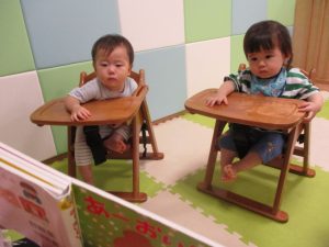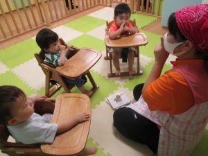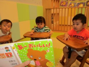 0歳児クラスのももぐみさんも絵本に興味を持ちはじめ、読み聞かせの時には興味津々のまなざしで見入っていますよ![]()
