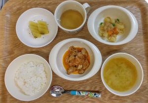 ご飯 味噌汁 若鶏のケチャップ煮 ツナポテ煮 キウイ