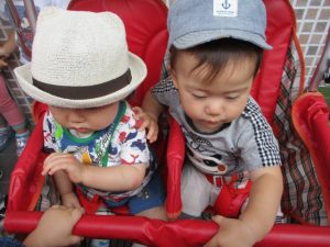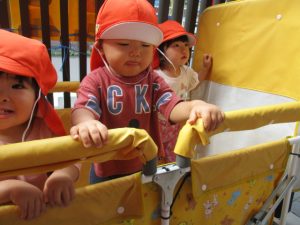ももぐみさん? いちごぐみさん?は、散歩車に乗って準備OKです![]()