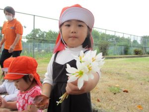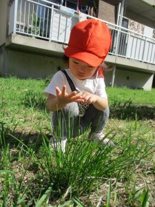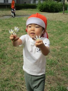 別の日に行った公園でもお花?を見つけて。「先生、見て
