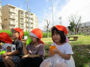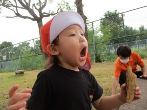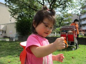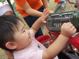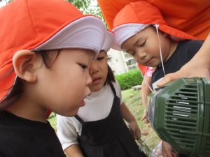 保育者がトンボを見つけ虫かごに入れると、「見た~い!」と~みんな近寄ってきましたよ![]()