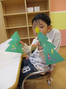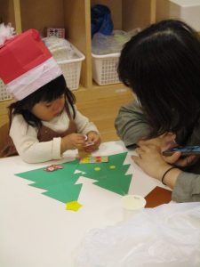 ツリーの形にシールを貼り 親子でいっしょに 楽しんでいましたよ ![]()