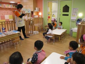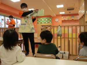 今回は、朝のおやつの前の読み聞かせの様子です![]()