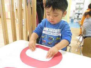 また、顔のパーツを貼る時には保育者に位置を教えてもらったり、自分で置いてみたりしながら行いました?