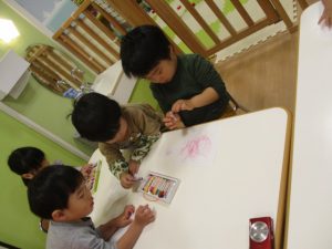 何色で描こうか悩みながら、お友だちが描いている絵を見て会話を楽しむ姿がありましたよ?