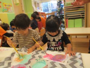 絵を描くだけではなく、その上にピンクor水色の絵の具を塗ることではじき絵という綺麗な羽子板が完成しました✨