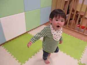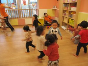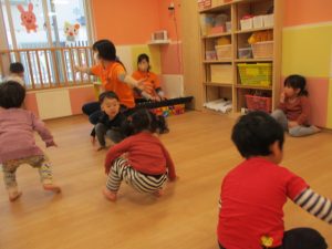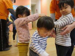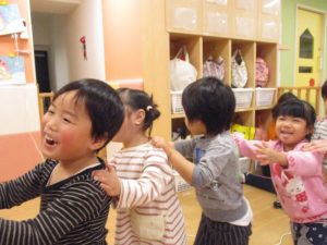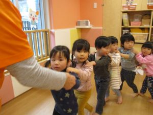 始めは、りんご組さん?汽車になって、お部屋をお散歩です?