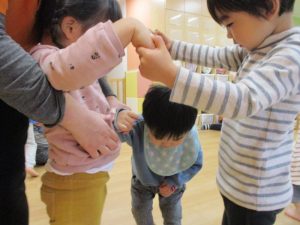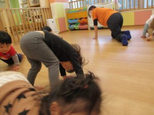 りんご組さんにトンネルになってもらい、その中をもも組さんやいちご組さんが汽車になってくぐっていきます?