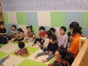 終わった後、保育者の話を聞いています。