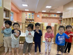 りんご組さんが前に出てきて、「Baby shark」をうたってもらいました![]()