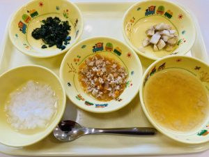 粥 野菜スープ(たまねぎ) 鶏と野菜の煮物 ほうれん草のつぶし煮 バナナ
