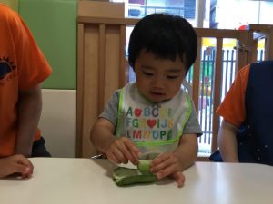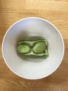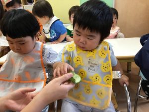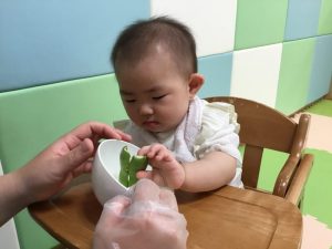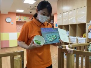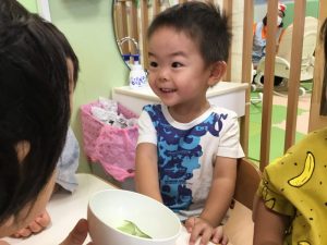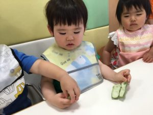 そんな日の朝、給食のえみこ先生から「このそら豆、お子様に見せて触らせてあげてください!!」と言ってもらい、保育者と子どもたちで触りましたよ![]()