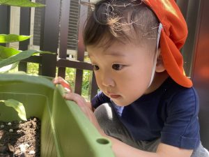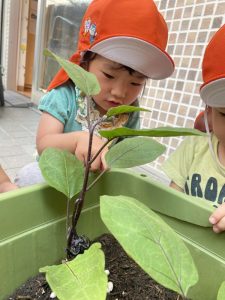 「紫のお花咲いてるね!」「ここになすびあるよ!」など友だちとたくさん会話しています