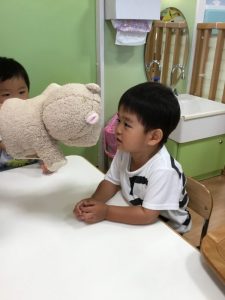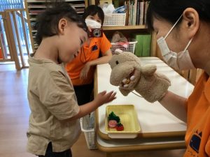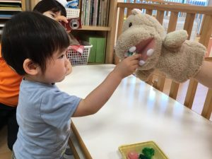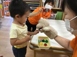 かばおくんはお腹が空いたのでお弁当を食べます「ぼくに食べさせてくれる人?」とかばおくんが言うと手を挙げてくれ、食べさせてくれましたよ。