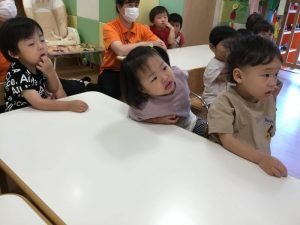 かばくんがお話をしているのを見て真剣な表情をしている子どもたちです