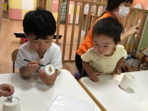 まずは手作りのカスタネットと鈴にお絵描きやシール貼りをしました