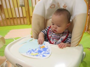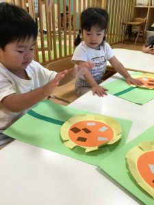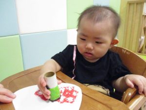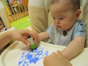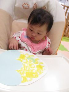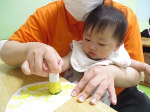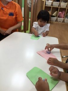最初に白い画用紙に絵の具のスタンプをしていきました