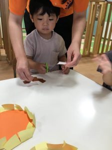 次はカラフルな画用紙にスタンプとシール貼りをしました?