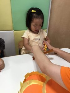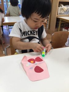 スタンプをした翌日、絵の具が乾いてからフルーツを飾っていきました