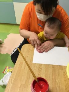 絵の具を含んだ筆を使って手のひらを塗っていくと