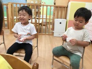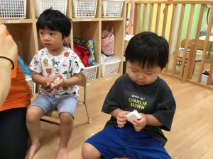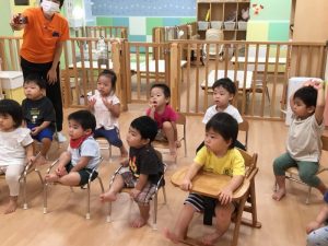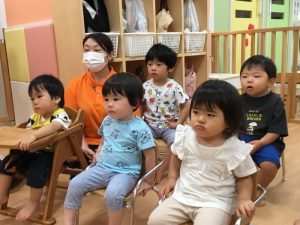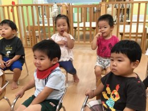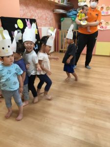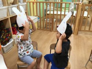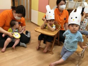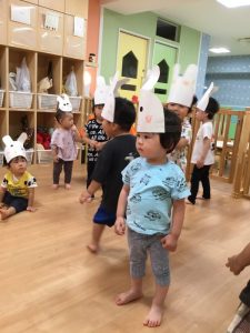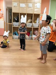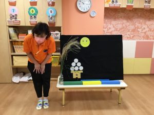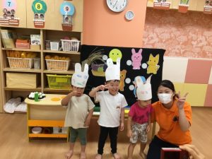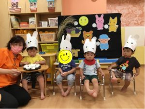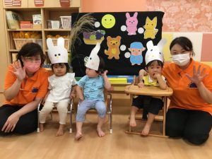 お団子もできたので、うさぎのお面をつけて、みんなで盆踊り「月夜のぽんちゃらりん」をしましたよ![]()