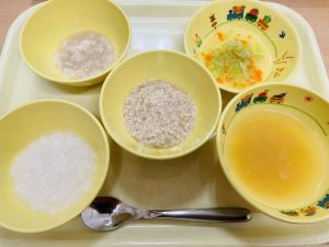 粥 味噌汁 鶏そぼろ煮 野菜の煮浸し 里芋の煮物