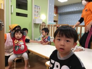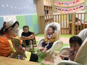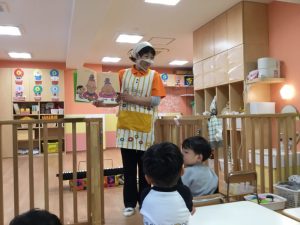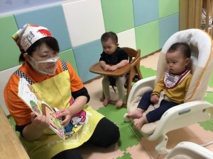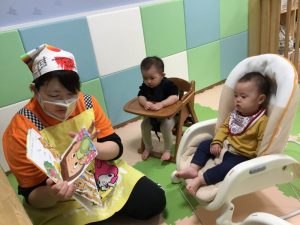 日頃は、目元から表情を意識した保育を心がけていますが、この日は顔がよく見えるので、子どもたちも集中して絵本を視聴することができました?