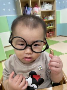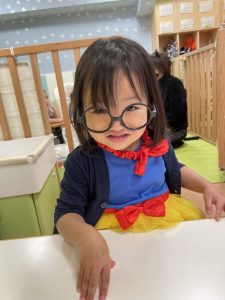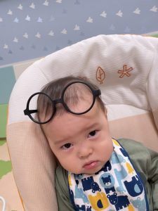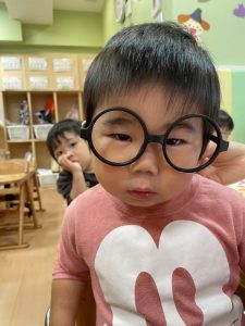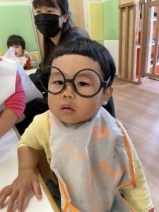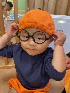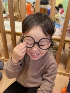 保育者が仮装で使ったメガネを付けてみた子どもたちです?