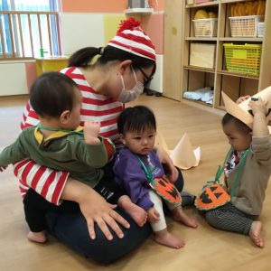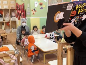 ハロウィンにちなんだ絵本を見て、