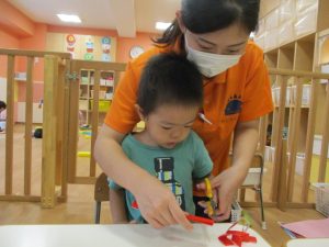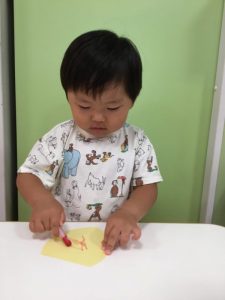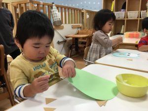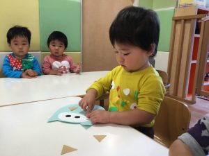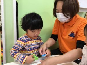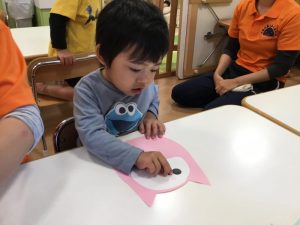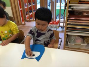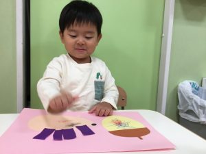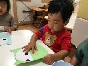 ハリネズミではハリの部分を自分で色を選び、保育者に手を添えてもらいながらハサミで切り、ノリで貼りました✂️