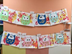 フクロウの体の模様をフエキノリを使ってノリの感触を楽しみながらヌリヌリ![]()
