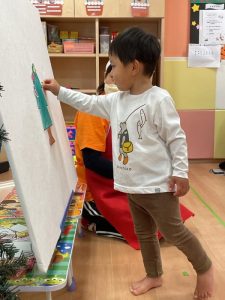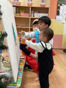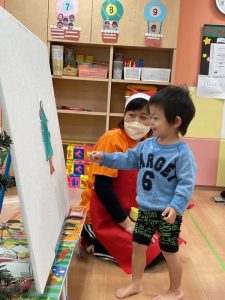 英語の歌「What Do You Want For Christmas?」の曲に合わせて、保育者の描いた絵を見ながら、汽車、ロケット、ロボット、テディベアの動きを楽しみました