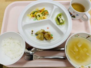 ご飯 味噌汁 魚の磯辺焼き マカロニサラダ キウイ