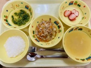 ※給食を食べながら、「今日のおやつな~に?」という声が聞こえ、おやつも楽しみにしている様子でした。お話しも上手になり、ほのぼのとした給食の時間になりました♪